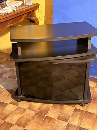 Mueble de televisión con diseño moderno y funcional. - Estructura de madera y cristal. - Incorpora una vitrina con puertas. - Ruedas para fácil movilidad.