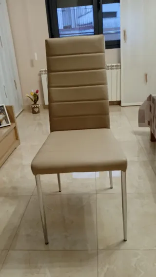 Conjunto de 4 sillas de comedor con un diseño moderno y elegante. - Patas metálicas plateadas. - Tapicería en piel sintética de color beige con signos de uso - Respaldo con líneas horizontales. - Precio algo negociable.