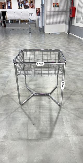 Cesta metálica con un diseño moderno y funcional. - Estructura de alambre resistente. - Base cuadrada con patas tubulares. - Acabado cromado brillante.