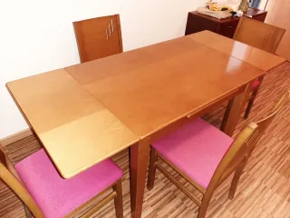 Conjunto de mesa de comedor con cuatro sillas. - Mesa de madera con extensión. - Sillas con asiento tapizado en color rosa.