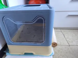 Caja grande de arena para gatos con diseño cerrado. Fabricada en plástico resistente y fácil de limpiar. - Tapa superior con rejilla. - Entrada lateral. - Color azul claro.