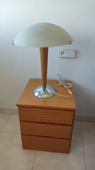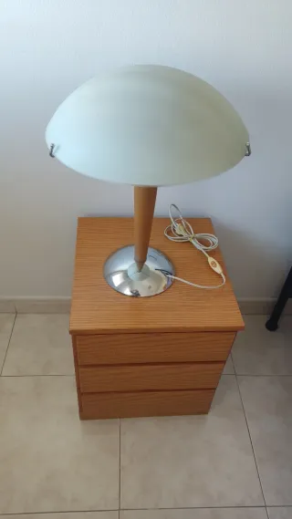 Lámpara de mesa de diseño icónico. - Pantalla de cristal esmerilado. - Base y pie de metal pulido. - Pie central de madera.