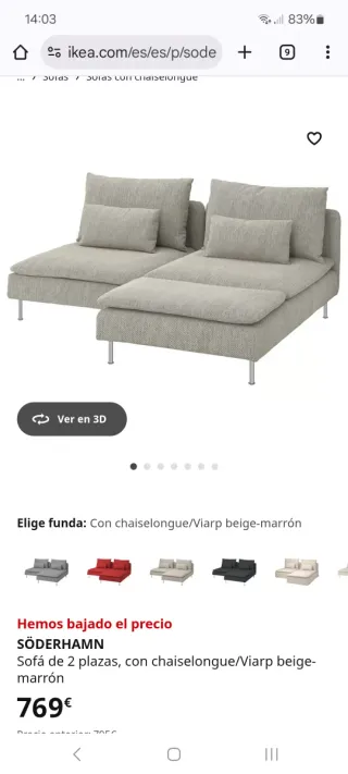 Sofá SÖDERHAMN de 2 plazas con chaise longue, tapizado en tela beige-marrón. Preu nou: 769€ - Diseño moderno y confortable. - Funda extraíble para facilitar la limpieza. **El sofá té uns 5 anys, està en bones condicions (es pot veure a les fotos). Tot i que no s'aprecia a les fotos, la zona del coixí del cap està un pel engroguit del ús, però es pot canviar la funda.