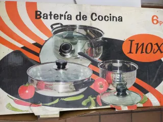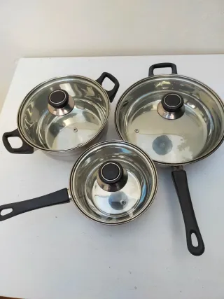 Set de cocina de 6 piezas con acabado en acero inoxidable. - Incluye ollas y sartenes con tapas de cristal. - Diseño moderno y funcional.