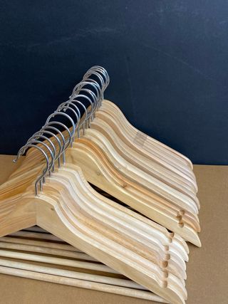 Lote de 50 perchas de madera, distribuidas en dos tamaños diferentes para adaptarse a tus necesidades de organización. - Fabricadas en madera resistente. - Color marrón natural.