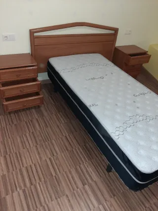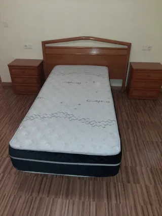 Conjunto de somier y colchón Grafeno de 90x190 cm. Cabezal y dos mesitas de noche con tres cajones. - Colchón Grafeno nuevo. - Somier con estructura de metal y madera.