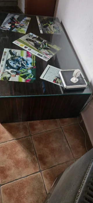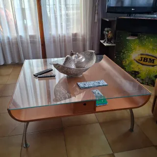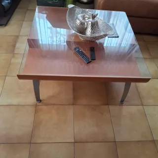 Elegante mesa de centro con base de madera y superficie de cristal. - Diseño moderno y funcional. - Combina materiales de calidad para un acabado sofisticado.
