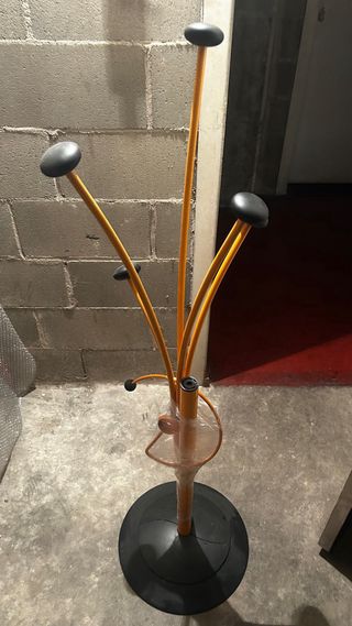 Elegant penjarobes amb espai que fa la funció de paraigüer de color taronja amb base circular. Elegante perchero con espacio que hace la función de paragüero con una base circular. - Estructura metàl•lica / metálica. - Puntes de plàstic. - Base de 35 cm.