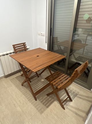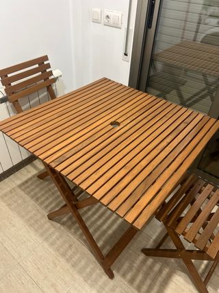 Conjunto de mesa y dos sillas plegables de madera. Ideal para espacios pequeños o para tener a mano cuando necesites un asiento extra. - Mesa cuadrada con diseño de listones. - Sillas plegables a juego. - Fácil de guardar y transportar. Solo recogida.