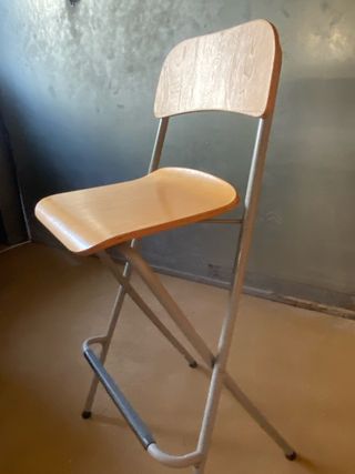 Conjunto de dos taburetes altos plegables de Ikea. Son perfectos para espacios reducidos y fáciles de guardar. - Asiento y respaldo de madera. - Estructura de metal. - Reposapiés integrado.