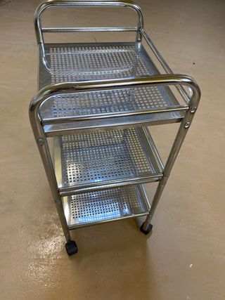 Carrito auxiliar de metal con tres niveles y ruedas para facilitar su movilidad. Su diseño es moderno y funcional. - Estructura de metal. - Bandejas perforadas. - Ruedas de plástico. - Medidas: 70x 40 x 32