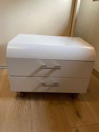 Conjunto de dos mesitas de noche con un diseño moderno y funcional. Son fáciles de mover gracias a sus ruedas. - Acabado liso y redondeado en la parte superior. - Dos cajones con tiradores metálicos. - Un cajón escondido en la parte superior. - Base con ruedas para movilidad. - Medidas: 60 x 45 x 45cm