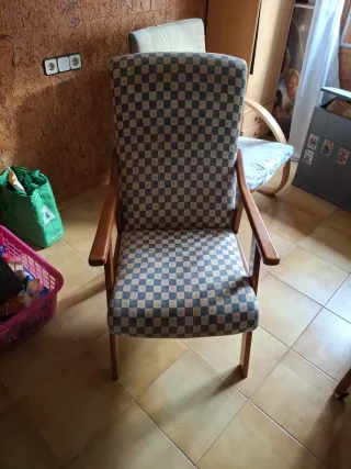 Acogedor sillón con un diseño clásico y estampado a cuadros. - Tapicería de tela resistente. - Patas y reposabrazos de madera.