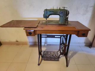 Máquina de coser antigua con mesa de madera y pedal. - Marca Refrey. - Incluye mesa de madera con extensiones laterales. - Pedal de accionamiento.