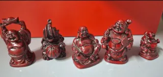 Conjunto de cinco figuras decorativas de Budas de la Suerte. - Diseño tradicional con sonrisas. - Tonos rojos intensos. - Ideal para coleccionistas o decoración.