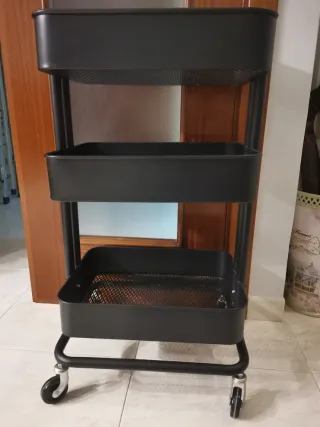 Carrito auxiliar de tres niveles con ruedas. - Estructura metálica. - Diseño moderno y funcional. - Nuevo tiene un precio de 29,99€.