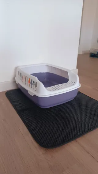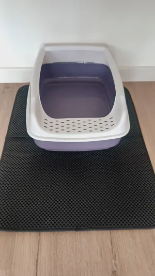 Conjunto de arenero y alfombra para gatos. - Arenero de plástico morado con borde blanco y diseño de gatos. - Alfombra negra con textura de panal para atrapar la arena.