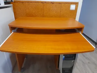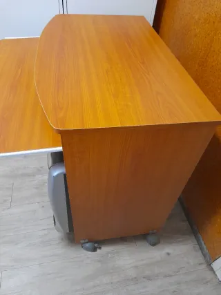 Mesa para ordenador en buen estado, con un diseño funcional y práctico. - Superficie de madera con acabado en tono miel. - Base con ruedas para facilitar su movilidad. - Estructura auxiliar en color gris.