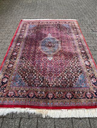 Elegante alfombra persa tejida a mano, con un diseño intrincado y colores vibrantes. - Motivos florales y geométricos. - Tonos rojos y azules predominantes. - Flecos en los extremos. Medidas:300X204