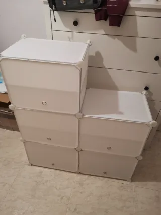 Mueble organizador de plástico blanco y metal, ideal para mantener tus zapatos en orden. Tiene una capacidad para unos 18 o 20 pares de zapatos (según si mantienes las baldas interiores o no y según el tipo de calzado). Tiene evidentes signos de uso de haberlo montado y desmontado en un par de ocasiones, pero que para nada afecta a su funcionalidad (podéis ver las fotos). - Diseño modular. - Puedes colocar cada cubículo como quieras (vertical, en horizontal, como está en la foto, etc.) - Nuevo tiene un precio de 35€. - Se vende desmontado. - Fácil de montar y de limpiar. - Las medidas son colocado en vertical.