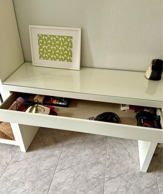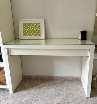 Tocador de estilo moderno con una superficie de cristal. - Acabado en blanco. - Tapa de cristal. - Cajón integrado.
