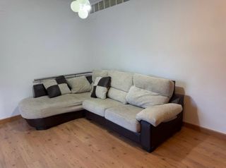Sofá modular de tela y piel en tonos beige y marrón. Se encuentra en condiciones aceptables. - Diseño en L. - Cojines cómodos. - Reposacabezas ajustables.