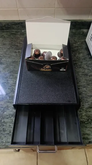 Práctica caja para almacenar tus cápsulas de Nespresso. Mantiene tus cápsulas organizadas y a mano. - Diseño elegante en color negro. - Cajón extraíble para fácil acceso. - Capacidad para numerosas cápsulas.