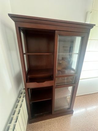 Elegante mueble expositor con puertas correderas de cristal y estructura de madera. - Diseño de líneas rectas y acabado en tono madera. - Puertas correderas de cristal para exhibir tus objetos. - Estantes interiores para organización. Precio negociable, venta en mano.
