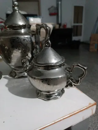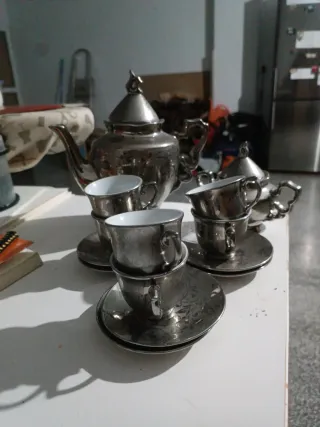 Elegante juego de tetera y tazas con un diseño detallado. - Tetera con tapa. - Juego de tazas y platillos.