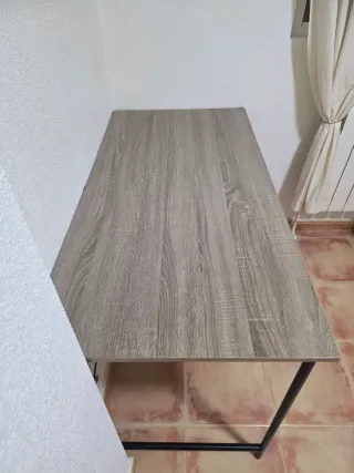 Mesa de escritorio con un diseño moderno y funcional. - Tablero de madera con acabado natural. - Patas de metal resistentes.