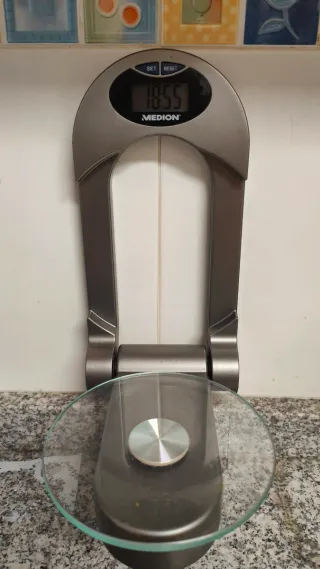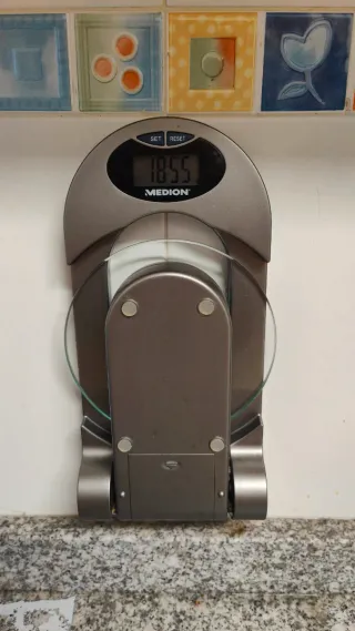 Báscula de pared de la marca Medion. Diseño moderno en color gris. - Pantalla digital. - Botones SET y RESET.