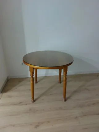 Mesa redonda con tapa de cristal y estructura de madera maciza. - Diámetro de 90 cm. - Extensible para mayor versatilidad. - Protector de cristal incluido.