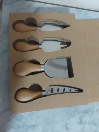 Conjunto de cuatro utensilios diseñados para servir y cortar quesos. Incluye diferentes tipos de cuchillos para adaptarse a distintas variedades de queso. - Cuchillo con punta para quesos duros. - Cuchillo plano para quesos blandos. - Tenedor para quesos. - Espátula para quesos.