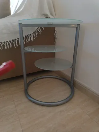 Mesa auxiliar con un diseño moderno y elegante. - Estructura de metal plateado. - Tres baldas de cristal movibles - Base circular de metal.