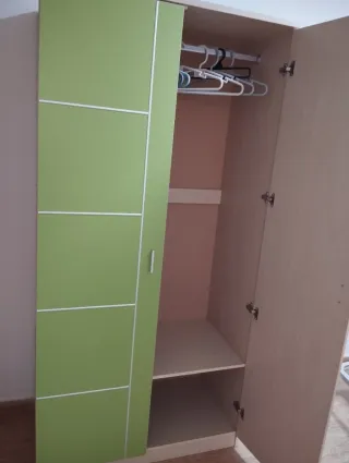Armario de dos puertas, una de ellas en color verde y la otra en madera. - Diseño moderno con líneas blancas. - Interior con barra para colgar ropa. - Estante inferior para almacenamiento.