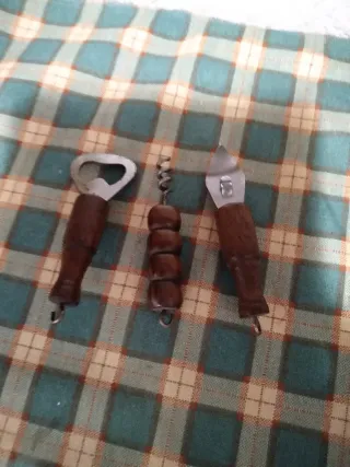 Conjunto de utensilios de cocina con mangos de madera y partes metálicas. - Abrebotellas. - Sacacorchos. - Abrelatas.