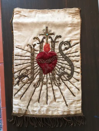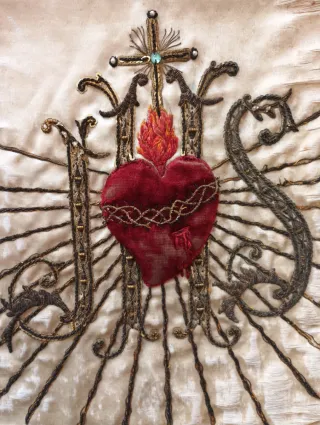 Cortina para sagrario con un hermoso bordado del Corazón de Jesús. Una pieza delicada y llena de simbolismo. - Diseño central del Corazón de Jesús rodeado de elementos decorativos. - Bordado detallado con hilos dorados y rojos. - Base de tela con textura.