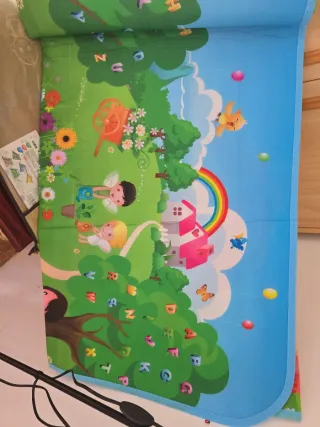 Alfombra de juegos con un diseño alegre y educativo, ideal para los más pequeños. Presenta un paisaje de ensueño con árboles, flores y un arcoíris. - Ilustraciones de niños, animales y letras del abecedario. - Colores vivos y llamativos. - Borde azul.