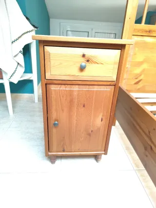 Mesita de noche de madera con un cajón y un armario. - Cajón con tirador metálico. - Puerta de armario con tirador metálico. - Patas de madera torneada. PTE PONER MEDIDAS