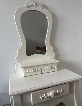Elegante tocador de estilo vintage con un diseño clásico y detalles florales. - Acabado en color blanco. - Fabricado en madera. - Incluye espejo. - Cajones decorados con motivos florales.