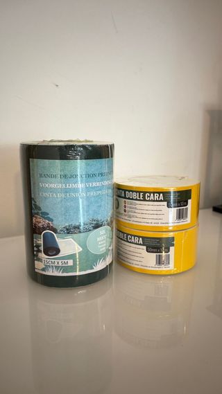 Lote de cintas para la instalación de césped artificial. Incluye cinta de unión y cinta doble cara. - Cinta de unión pre-engomada. - Cinta doble cara para césped sintético. - Medidas cinta unión: 15cm x 5m. - Medidas cinta doble cara: 50mm x 10m. finalmente no instalamos el césped y nos quedaron aquí.