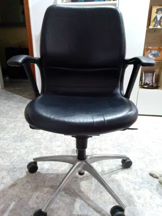 Silla de escritorio con un diseño moderno y funcional. - Asiento y respaldo tapizados en piel. - Base de cinco radios con ruedas. - Brazos integrados.