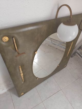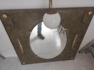 Espejo ovalado, con plafón blanco, adornos en las 4 esquinas y los dos laterales dorados,dos perchero uno a cada lado dorado y forrado en piel de cuero verde , muy bien conservado.