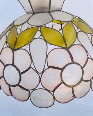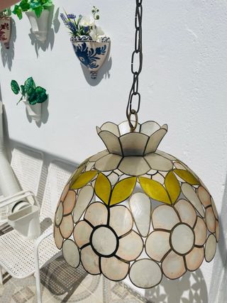Preciosa lámpara de techo vintage. Ideal para dar un toque de estilo a cualquier espacio. - Fabricada con nácar y metal. - Diseño con flores de colores rosa y verdes. - Perfecta para salones o dormitorios. Tiene un pequeño golpe, que apenas se aprecia ( por eso el precio ),