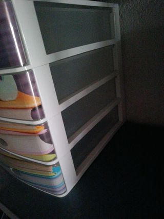 Bonito organizador de escritorio con 4 cajones. Ideal para mantener tus cosas ordenadas. Altura cajones 8 cm - Diseño con letras y libros. - Perfecto para escritorio u oficina. - Fabricado en plástico resistente.