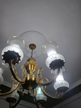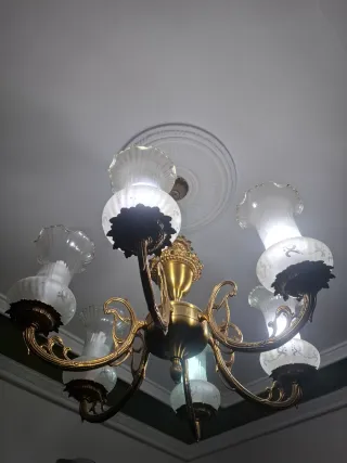 Elegante lámpara de araña con seis puntos de luz. Su diseño combina metal dorado y cristal transparente, aportando un toque de distinción a cualquier espacio. - Seis brazos. - Detalles ornamentales dorados. - Pantallas de cristal con diseño. Dispongo de 2 iguales. 30€ cada una