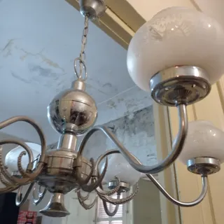 Elegante lámpara de techo de estilo vintage. Combina un diseño clásico con materiales de calidad. - Acabado plateado en la estructura. - Globos de cristal esmerilado con detalles. - Diseño de seis brazos curvos.