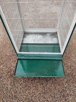 Jaula espaciosa para pájaros con estructura robusta. - Techo a dos aguas. - Base con bandeja. - Ruedas para facilitar el movimiento.