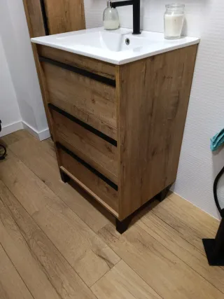 Mueble lavabo madera y banqueta, tapizada en piel.