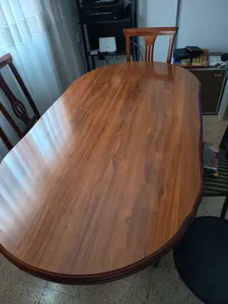 Elegante mesa de comedor con un acabado de madera natural. Mesa se abre y se hace más grande - Diseño ovalado. - Patas robustas. Mesa con 6 sillas en perfecto estado .Todo por 50 euros